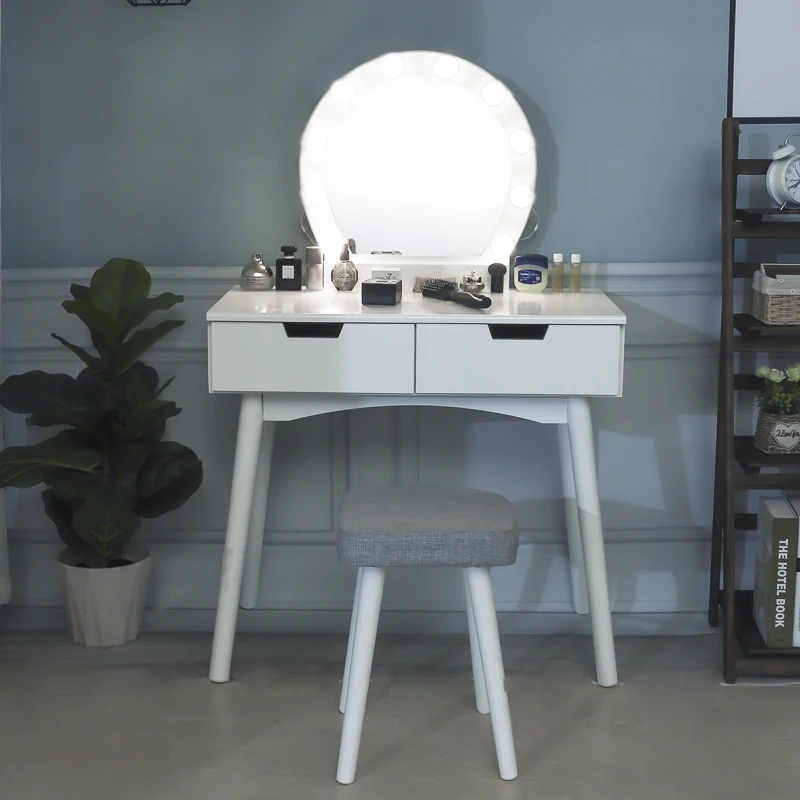 Giantex vanity table set with 12 lights mirror, bedroom makeup dressing table with 360° rotating oval mirror, 5 drawers and shelf, modern makeup table with cushioned stool for girls women (black) 4.2 out of 5 stars. Some vanity sets have shelves around the mirror where you can put decorations and candles. Get it as soon as tue, jun 8. Beautiful white wooden dressing table with a matching cushioned stool, 10 led lighted oval makeup mirror gives a warm glow at night, 360° rotating mirror can be adjusted to multiple angles. Vanity with lighted mirror and cosmetic organizer.